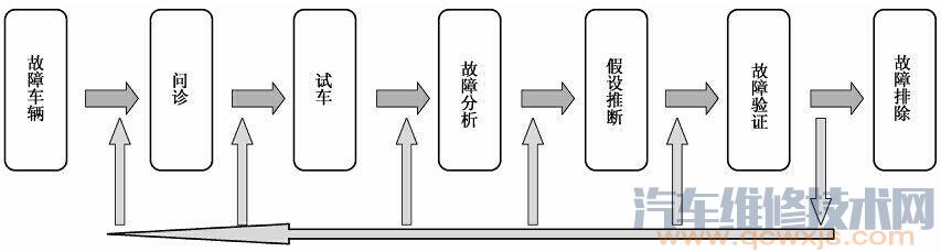 接收故障車輛后,首先要從問診開始,經過試車驗證故障車輛的癥狀,通過故障分析弄清故障的性質和大致范圍,假設推斷出可能的故障原因,通過故障重新驗證,最終排除車輛故障。