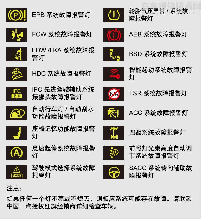 紅旗hs5故障報警燈:報警燈提示車輛各系統當前狀態或車輛相應系統當前可能存在的故障。
