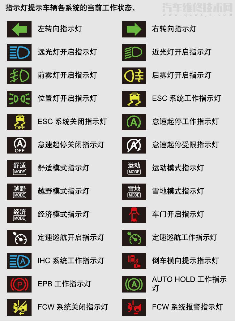 儀表指示燈:指示燈提示車輛各系統的當前工作狀態。