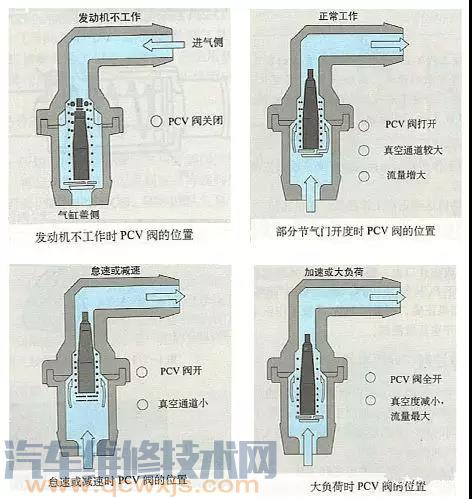 PCV閥是一個(gè)計(jì)量控制閥,由閥體、閥門、閥蓋、彈簧組成,不可分解,安裝在發(fā)動(dòng)機(jī)曲軸箱通風(fēng)系統(tǒng)與進(jìn)氣系統(tǒng)之間。PCV閥由真空度來控制,調(diào)節(jié)曲軸箱通風(fēng)系統(tǒng)產(chǎn)生的油煙進(jìn)入進(jìn)氣系統(tǒng)的流量,當(dāng)發(fā)動(dòng)機(jī)高速運(yùn)轉(zhuǎn)時(shí)的流量要比低速時(shí)要高,同時(shí)當(dāng)發(fā)動(dòng)機(jī)發(fā)生回火時(shí),PCV閥應(yīng)能切斷通風(fēng)防止曲軸箱爆炸。