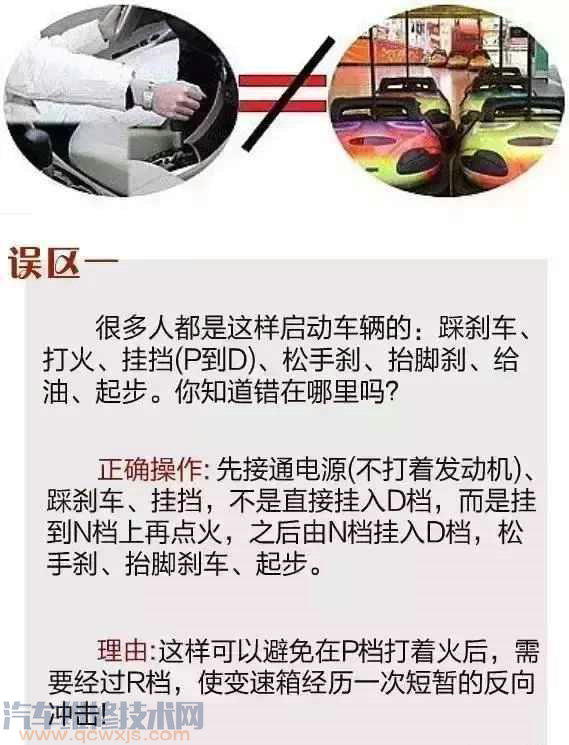 正確操作:先接通電源(不打著發動機)、踩剎車、掛擋,不是直接掛入D檔,而是掛到N檔上再點火,之后由N檔掛入D檔,松手剎、抬腳剎車、起步。