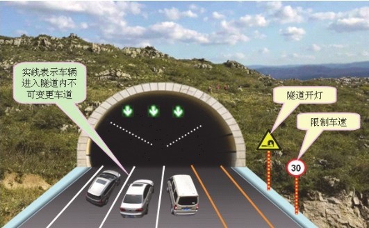 ①隧道入口處有限速標志的,要按照交通標志規定的車速行駛。屬于單行路或者交替通行的隧道,洞口處還設有交通信號燈的,車輛要在綠燈亮時才能進入隧道。