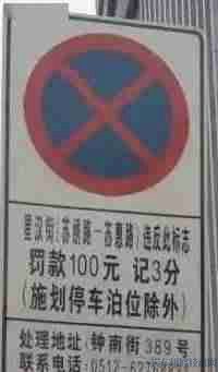 上圖表示:在標記路段嚴禁停車,違反則處以100元罰款加記3分的處罰。