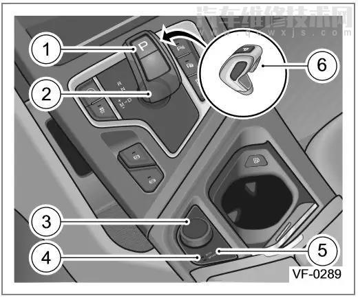 1. P檔按鈕 2. 電子換檔桿 3. 駕駛模式開關 4. ECO模式指示燈 5.SPORT模式指示燈 6. 檔位解鎖按鈕