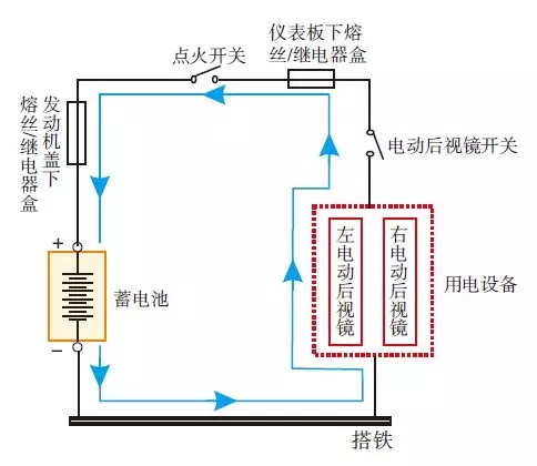 任何一個完整的電路都是由電源、保險絲、開關、控制裝置、用電設備、導線等組成的。電流流向必須從電源正極出發,經過保險絲、開關、控制裝置、導線等到達用電設備,再經過導線(或搭鐵)回到電源負極,構成回路。