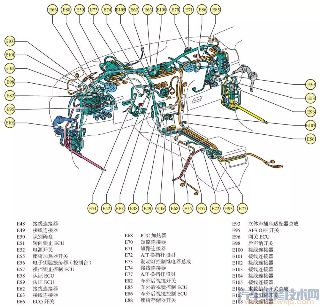 電路布線圖主要表明元器件在汽車上的位置,一般包括發動機艙、儀表板、車身、電動座椅等部位。另外,布線圖還包括配線連接器、接地點和鉸接點位置圖。配線連接器用于連接各元器件和配線之間的電路。