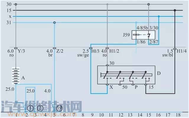 最上區域內部水平線為接電源正極的導線,有30、15、X等。電路中經常通電的線路使用代號30,接地線的代號是31,受控制的大容量用電設備的電源線代號是X,受控制的小容量用電設備的電源線代號是15。
