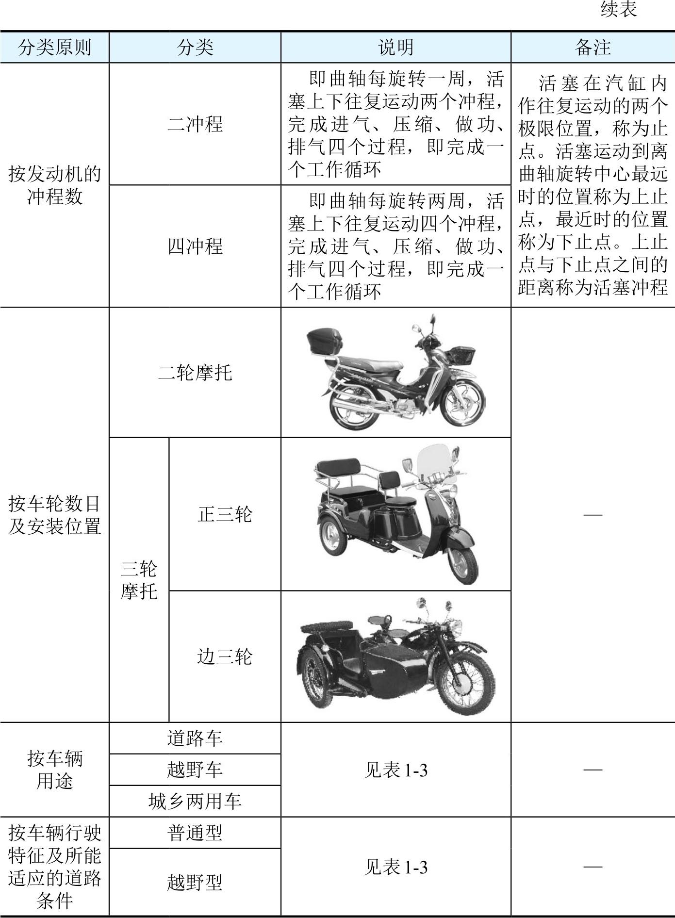表1-1 摩托車的分類方法