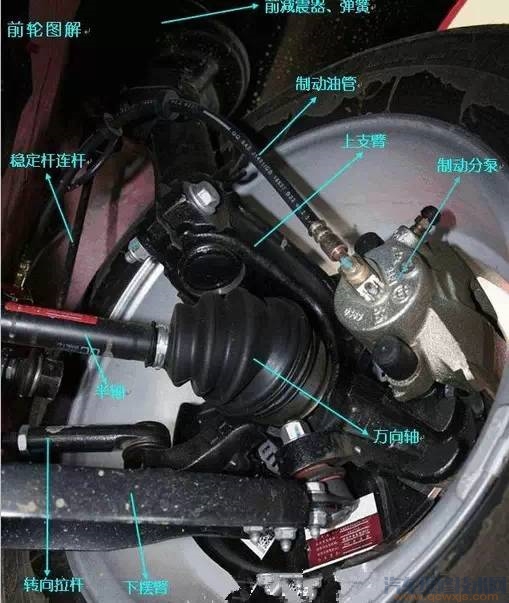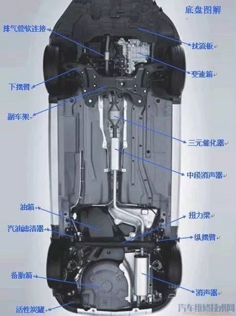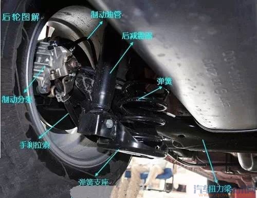 汽油濾清器:安裝在右后輪前方,油箱旁邊,作用是濾除汽油中的水分、雜質和膠質,防止燃油系統堵塞,保證燃油供給裝置的正常工作。制動分泵:將制動液的液壓力轉化為機械力,作用于制動卡鉗上。卡鉗上的摩擦片與制動盤產生摩擦,將車的動能轉化為熱能消耗掉,從而使汽車停止。萬向軸:連接在兩個軸之間,在一定范圍內可任意改變兩軸間的傳動角度。因為前輪是既要驅動,又要轉向的嘛~!彈簧:彈性元件,起緩沖作用。這個是螺旋彈簧,卡車用的是鋼板彈簧,某些高檔車用的是空氣彈簧。減震器:液壓阻尼元件,吸收路面沖擊的能量,并抑制彈簧壓縮后回彈的力。它與彈簧配合組成了減震系統,用于減緩因路面不平引起的車體震動。減震器的阻尼力與彈簧的彈力,經過不同的調教匹配會產生出不同的底盤風格,比如運動型、舒適型。手剎拉索:拉手剎時將后輪制動,就跟自行車閘差不多。三元催化器:將廢氣中的NOX,CO等有害氣體轉化成N2,CO2等無害氣體,降低排放污染。消聲器:消除發動機排氣的噪音。沒有了這個東西,那我們的車都要像跑車一樣轟鳴了。活性碳罐:裝在車尾右側的一個黑色的小罐,內部裝滿活性炭,連接著油箱,作用是吸附汽油蒸汽。,當汽車開動的時候,活性碳罐電磁閥適時打開,將吸收的燃油蒸汽重新倒入進氣歧管,以達到節約燃油和環保的目的。扭力梁:扭力梁式半獨立懸掛的構件,能產生一定扭轉形變,使懸掛性能介于獨立懸掛和非獨立懸掛之間。這種懸掛的特點是成本低,強度高,占用空間小,舒適性一般,多用于小型車上。 (汽車維修技朮wang www.011315.cn 原創 )