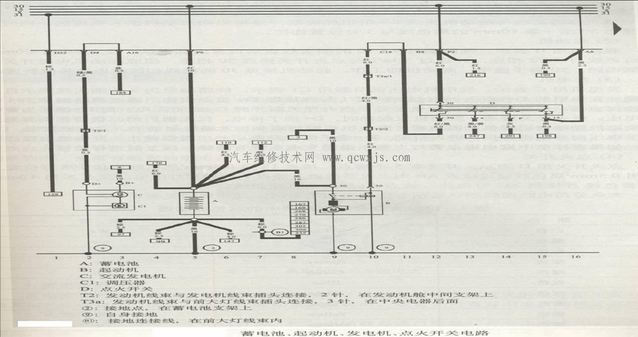 蓄電池的正極與起動(dòng)機(jī)接點(diǎn)30用粗線連接,是用來向起動(dòng)機(jī)供大電流的。同時(shí)通過接點(diǎn)30用一條1Omm2的黑色線與3號(hào)位置連接。