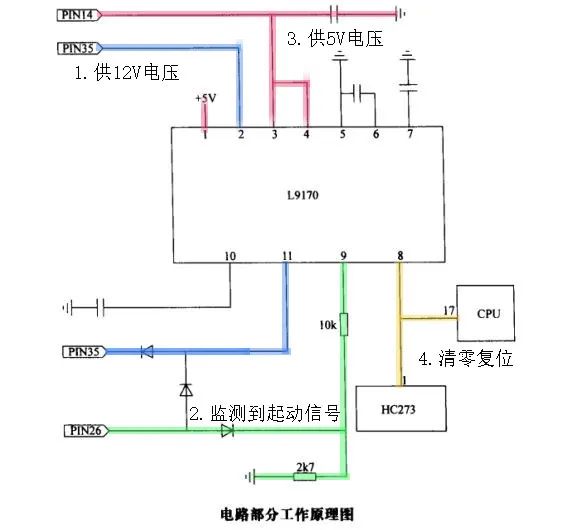 電腦板上電后,會將12V電壓加到L9170上,當L9170收到起動信號后,會輸出5V電壓供電腦板本身使用,同時也為外部傳感器提供5V電壓。另一方面會向CPU和74HC273輸入復位信號,使電腦板復位,同時74HC273為避免發生錯誤的控制動作而進行清零操作。