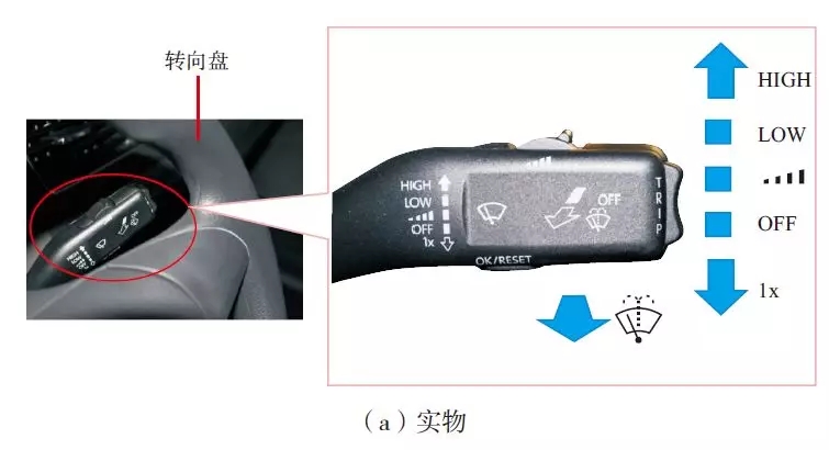 洗滌器是向擋風玻璃上噴水,而刮水器是將擋風玻璃刮拭干凈,確保駕駛員有良好的視線。刮水器及洗滌器開關一般安裝在轉向盤右下方,如下圖所示。