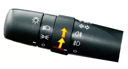 在前照燈開關位于或時可使用霧燈。如下圖所示,向前旋轉旋鈕,打開霧燈,向后旋轉旋鈕,關閉霧燈。可以從組合儀表上看到霧燈的開關狀態。旋鈕向前轉動1次,打開前霧燈;旋鈕再向前轉動1次,后霧燈與前霧燈同時點亮。
