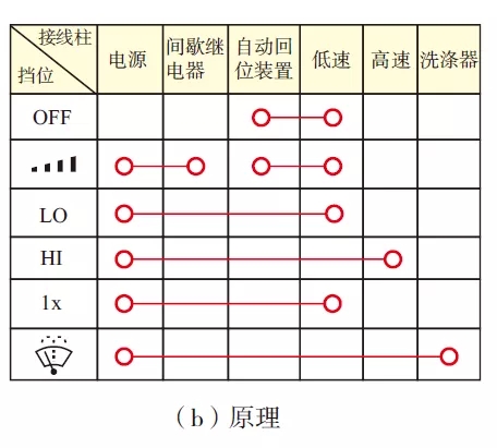 OFF關閉位置,當刮水器開關置于OFF擋時,自動回位裝置與電動機低速接通,轉到一定角度后停轉;間歇工作,當向上撥動操作桿到1擋時,自動回位裝置與電動機低速仍然接通,同時電源與間歇繼電器一端接通,間歇繼電器進入間歇工作狀態;LOW低速工作:當向上撥動操作桿到2擋時,電源與電動機低速接通,電動機低速運轉;HIGH高速工作,當向上撥動操作桿到3擋時,電源與電動機高速接通,電動機高速運轉;1x點動刮水,當在OFF位置向下撥動操作桿時,電動機低速短暫接通,電動機短促運轉;向后撥動操作桿可使風窗洗滌液噴出,可對車窗玻璃進行洗滌。