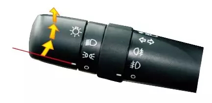 燈光關閉,全部燈光熄滅;前小燈、尾燈、牌照燈、儀表板燈點亮;近光燈打開,前小燈、尾燈、牌照燈、儀表板燈仍然點亮,在此擋時,向前推手柄即可變遠光。