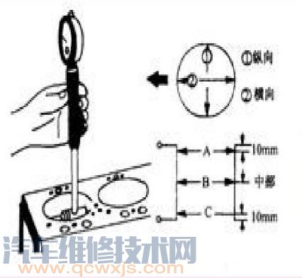 根據氣缸的磨損規律,測量缸徑時,應在氣缸軸向三個截面、三個方位上測量。最上面的截面在氣缸的上部,相當于活塞行程上止點時,第一道活塞環所在的位置,約距缸頂15mm;第二截面在氣缸的中部,約距缸頂35mm;第三截面在氣缸的下部接近下邊緣處,約距缸頂70mm。
