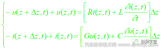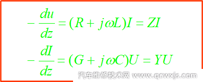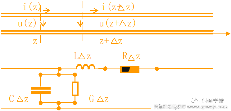 我們先來看一下傳輸線方程,這個顧名思義,就是描述傳輸線狀態的方程,也叫做電報方程。這個方程的基礎是長線效應:也就是當線長與波長相比擬的時候,就必須考慮微波的波動性,這個時候就需要用分布參數的方法來分析傳輸線的傳輸狀態,其等效電路圖如下圖所示