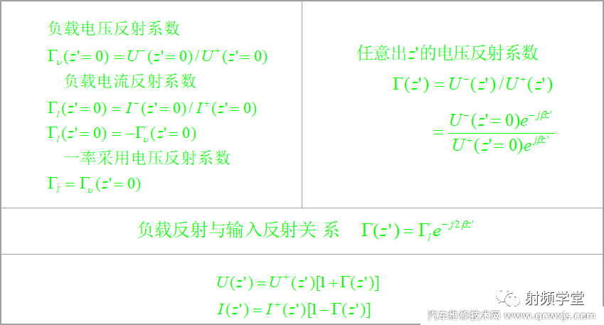 這個時候就引入了描述傳輸線上傳輸狀態的幾個參量:反射系數,特征阻抗,駐波比等。反射系數比較好理解,就是反射波和入射波的比值。反射系數的主要性質如下我們直接給出傳輸線的矩陣解,詳細過程可以參考《簡明微波》講義第5講