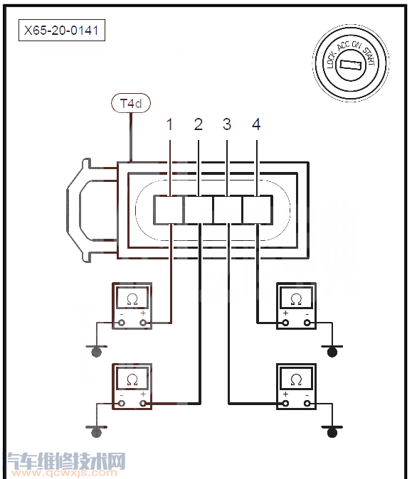 02-05 測量增壓溫度壓力傳感器T4d/1針腳、T4d/2針腳、T4d/3針腳、T4d/4針腳車身接地支架之間是否有短路情況。