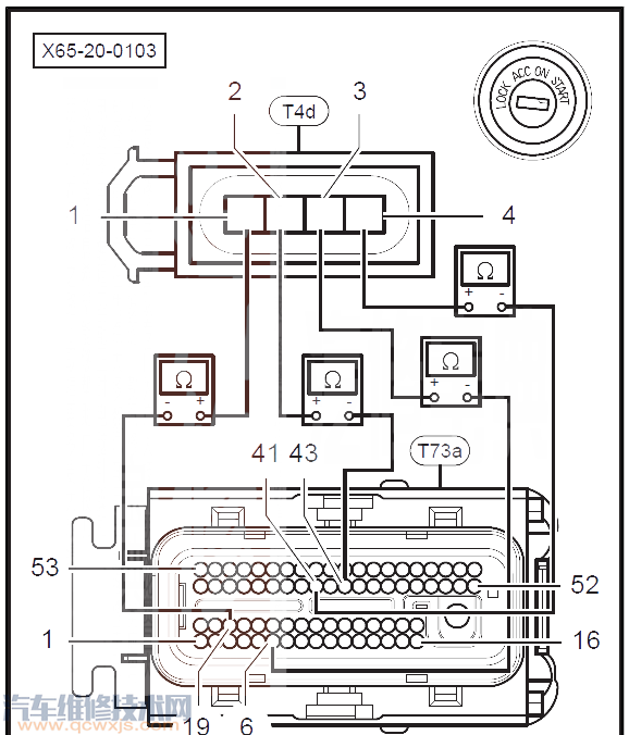 02-04 測量發動機控制單元T73a/6針腳與增壓溫度壓力傳感器T4d/3針腳、發動機控制單元T73a/41針腳與增壓溫度壓力傳感器T4d/4針腳、發動機控制單元T73a/19針腳與增壓溫度壓力傳感器T4d/1針腳、發動機控制單元T73a/43針腳與增壓溫度壓力傳感器T4d/2針腳之間是否有斷路情況。