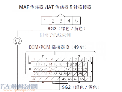 19 檢查MAF傳感器/IAT傳感器5針插接器2號端子與ECM/PCM插接器端子B32之間是否導(dǎo)通。