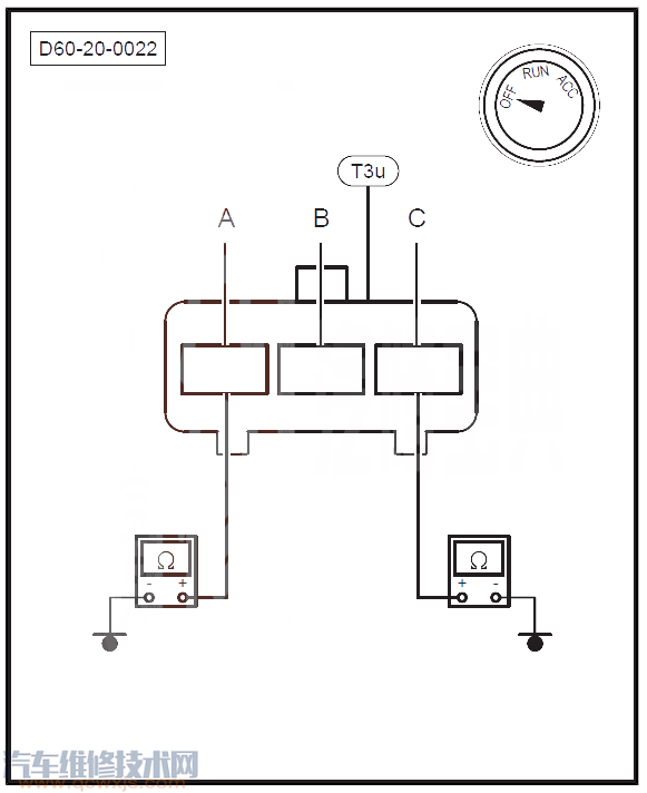 02-05 測量冷卻液傳感器插頭T3u/A針腳、T3u/C針腳與車身接地之間導線是否出現短路情況。