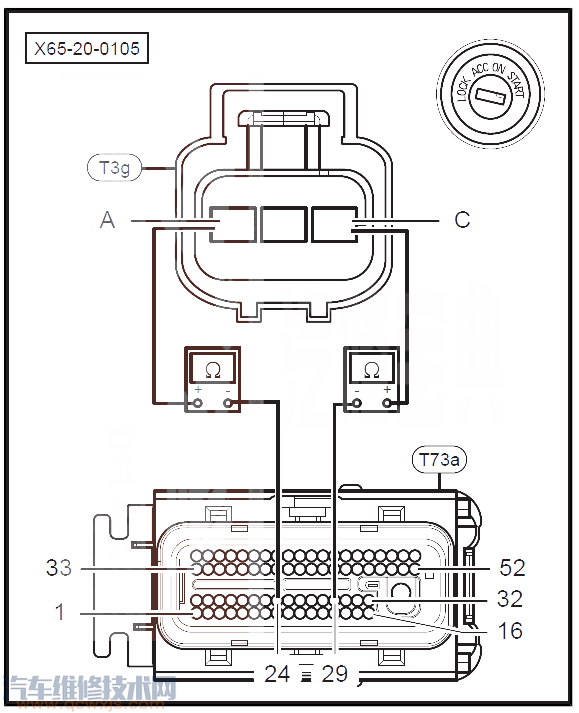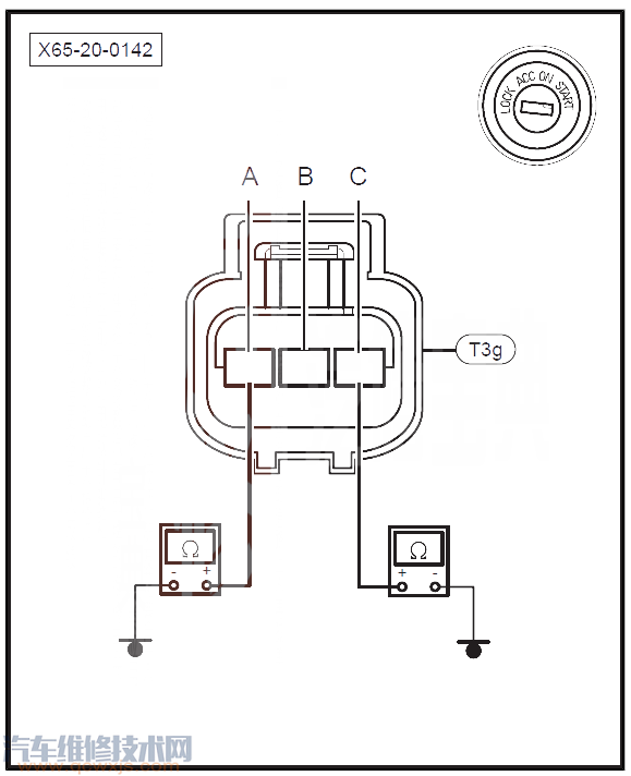 02-01 斷開冷卻液溫度傳感器連接插頭T3g,檢查T3g連接插頭是否有裂痕和異常,針腳是否腐蝕、生銹。