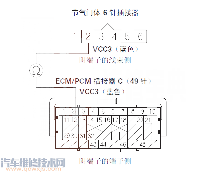 15 檢查ECM/PCM插接器端子C12 和節(jié)氣門體6針插接器2號端子之間是否導(dǎo)通。