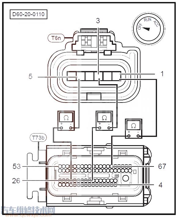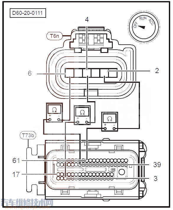 02-01 斷開節氣門控制器連接插頭T6n,檢查T6n連接插頭是否有裂痕和異常,針腳是否腐蝕、生銹。