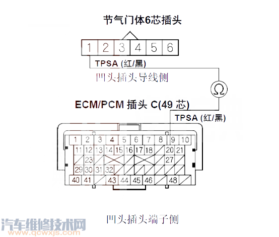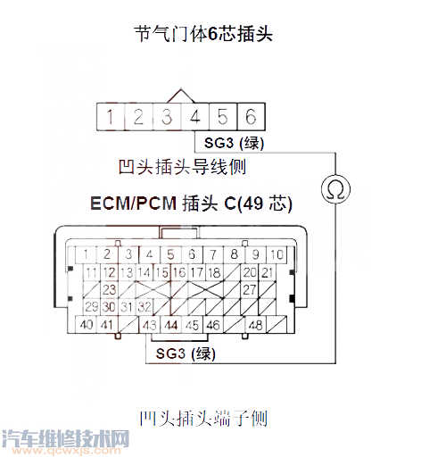 12 檢查ECM/PCM插頭C20端子與節氣門體6 芯插頭1號端子之間的導通性。