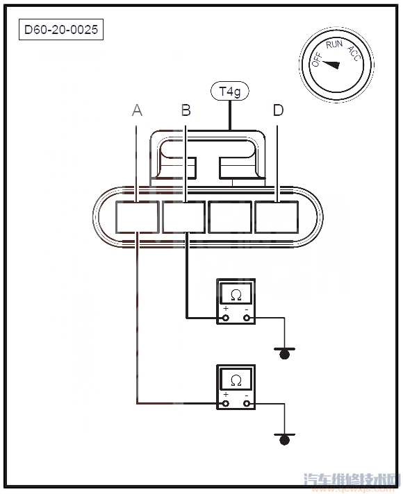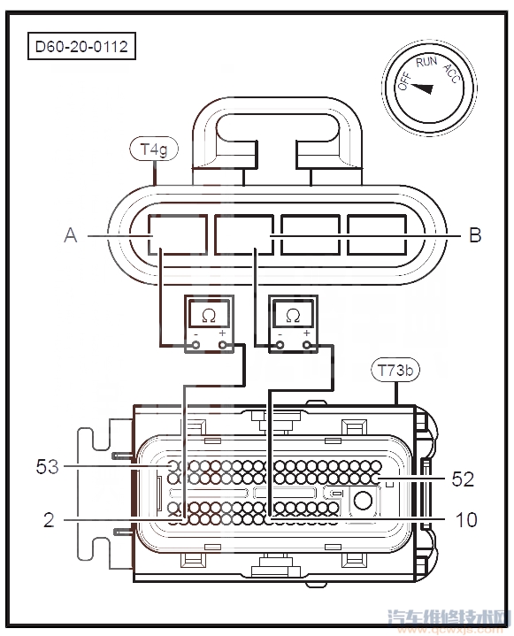 02-02 斷開前氧傳感器插頭T4g,檢查T4g連接插頭是否有裂痕和異常,針腳是否腐蝕、生銹。