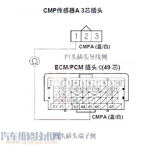 15 檢查CMP傳感器A 3芯插頭1 號端子與ECM/PCM插頭C45端子之間的導通性。