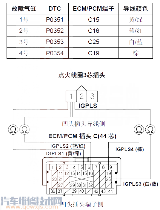 24 檢查故障氣缸的相應點火線圈3芯插頭1號端子與相應ECM/PCM插頭端子之間的導通性(見下表)。
