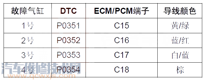 24 檢查故障氣缸的相應(yīng)點(diǎn)火線圈3芯插頭1號(hào)端子與相應(yīng)ECM/PCM插頭端子之間的導(dǎo)通性(見下表)。