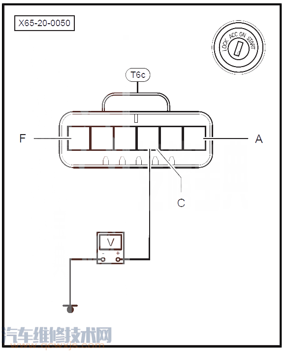 02-13 測量點火線圈插頭T6c/C針腳與車身接地之間電壓值,檢查導線是否對電源電路出現短路情況。