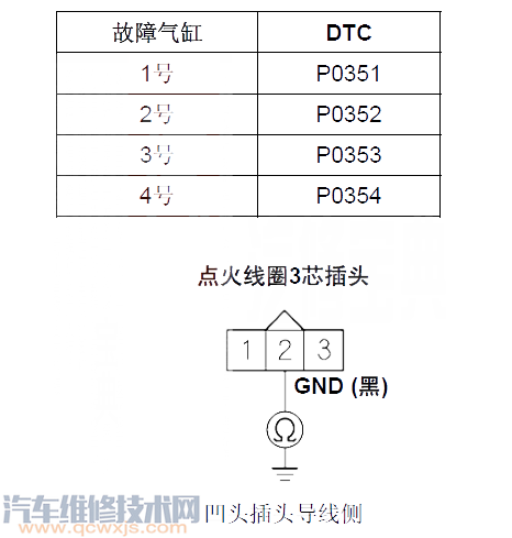 20 檢查故障氣缸的點火線圈3芯插頭2號端子與車身地線之間的導通性(見下表)。
