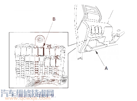 12 拆下駕駛員側儲物箱(A),然后將點火線圈繼電器(B)從儀表板下保險絲/繼電器盒上拆下。