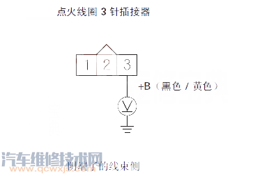 18 測量故障氣缸點火線圈3針插接器3號端子和車身搭鐵之間的電壓(參見表格)。