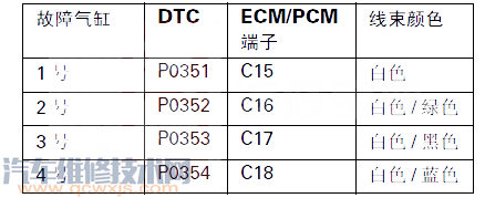 24 檢查相應的點火線圈3針插接器1號端子和故障氣缸相應的ECM/PCM插接器端子之間是否導通(參見表格)。