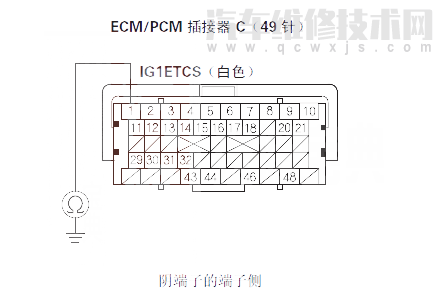 15 檢查ECM/PCM 插接器端子C1 和車身搭鐵之間是否導通。