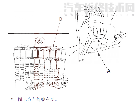 19 拆下駕駛員側儲物箱(A) ,然后將ETCS 控制繼電器(B) 從儀表板下保險絲/繼電器盒上拆下