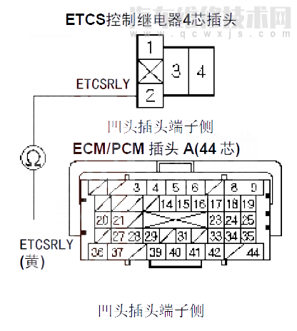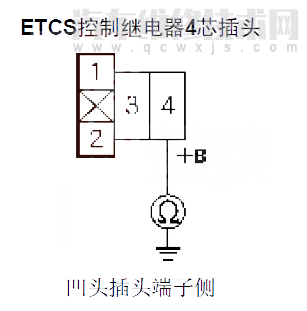 21 檢查ETCS控制繼電器4芯插頭4號端子與車身地線之間的導通性。