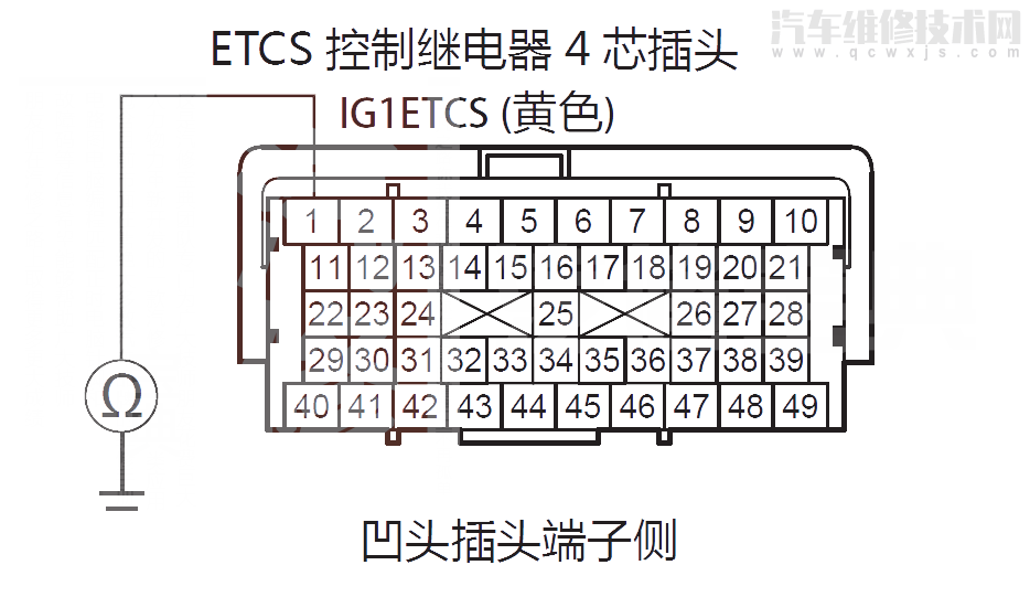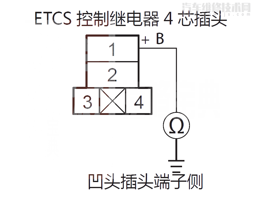 21 檢查ETCS控制繼電器4芯插頭1號端子與車身搭鐵線之間的導(dǎo)通性。