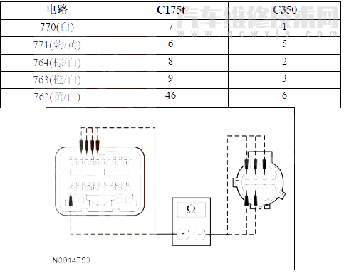 15-04 測量4x4模塊(PCM)C175t,線束側和分動箱C350,線束側之間下列電路的電阻: