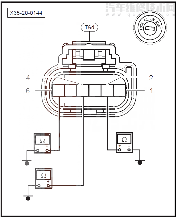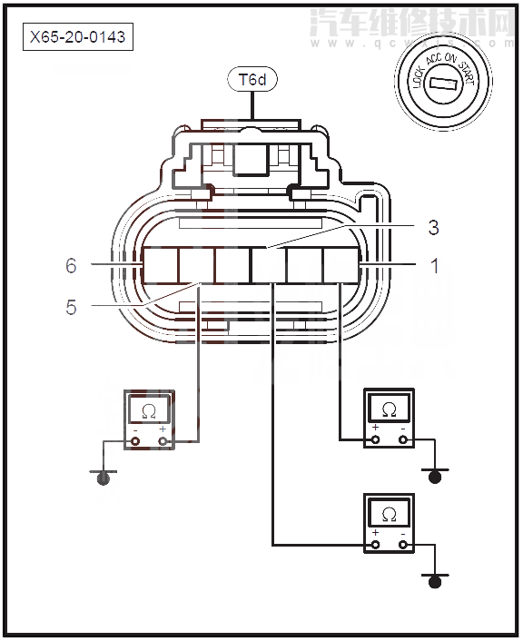 02-01 斷開節氣門控制器連接插頭T6d,檢查T6d連接插頭是否有裂痕和異常,針腳是否腐蝕、生銹。
