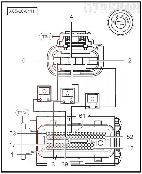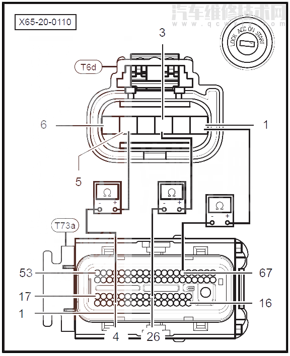 02-08 測量發動機控制單元插頭T73a/67針腳與節氣門位置傳感器插頭T6d/1針腳、T73a/26針腳與T6d/3針腳、T73a/4針腳與T6d/5針腳之間導線是否出現斷路情況。