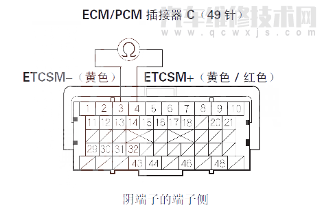 17 檢查ECM/PCM插接器端子C3和C4之間是否導通。