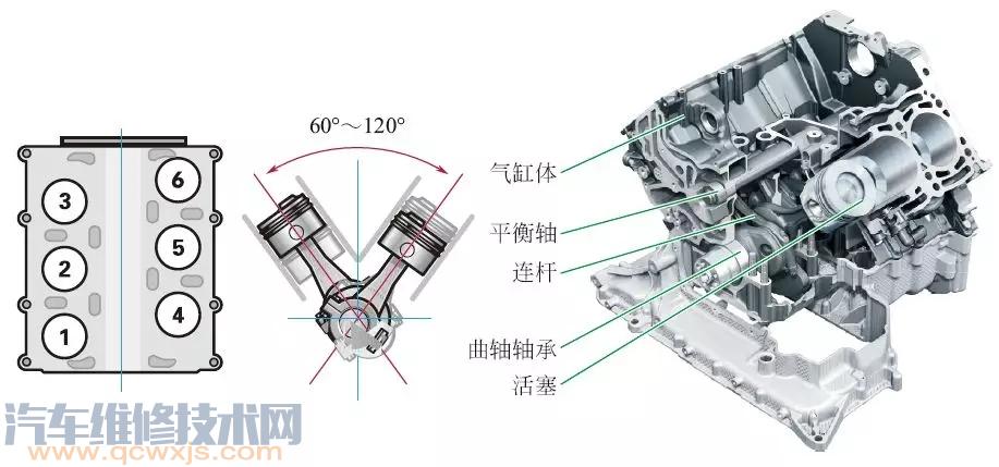 為了讓發(fā)動(dòng)機(jī)縮短,V型發(fā)動(dòng)機(jī)中的氣缸布置成60°~ 120°的夾角,并讓氣缸的中心線與曲軸的中心線相交。