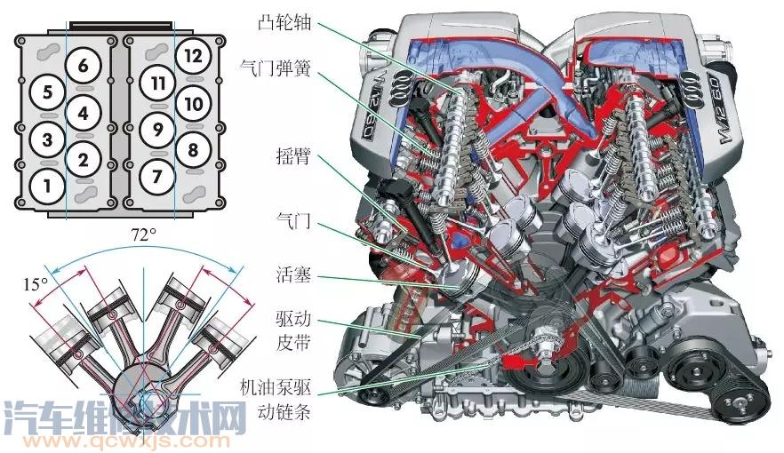 W家族的發(fā)動(dòng)機(jī)根據(jù)模塊化設(shè)計(jì)原則糅合了兩個(gè)“VR氣缸組”。單個(gè)氣缸組內(nèi)氣缸之間的夾角為15°,兩個(gè)VR氣缸組支架的夾角為72°。