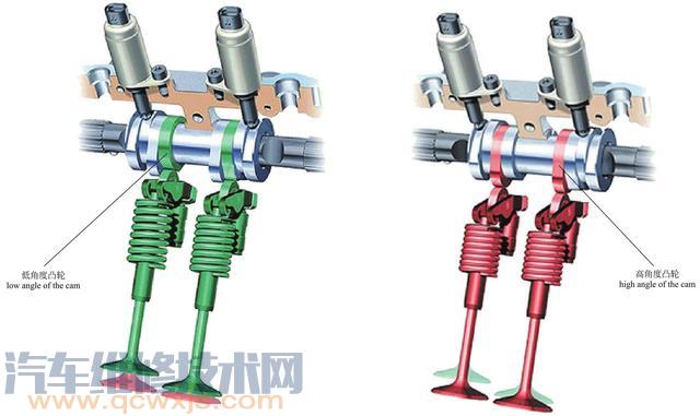 可變氣門升程系統主要通過切換凸輪軸上的低角度凸輪和高角度凸輪,來實現氣門的可變升程。
